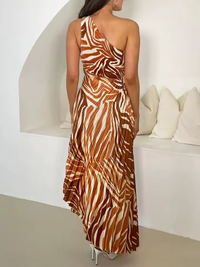 Give your wardrobe an energetic boost with the Celeste Vibrant Printed Dress – a striking statement piece that celebrates movement and colour. The asymmetrical neckline and pleats create a sculptural silhouette that moves with you with every step, while the asymmetrical hem adds just the right amount of drama. Whether you're taking a stroll along the coast or enjoying a night out on a rooftop, this dress is sure to turn heads.