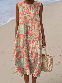 Embrace soft elegance with the Flora Dress, a breezy sleeveless beauty that radiates warmth and grace. Featuring a delicate coral and mint floral pattern, this dress is perfect for golden hour strolls, relaxed brunches, or sunny days spent barefoot. Its flowy cut and round neckline make it an easy, go-to favourite for the entire season.